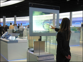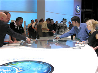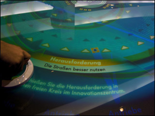 | Forschungsdesk Two interactive tables with tangible Interfaces. The visitors catch challenges to shoot them into the Centre of Innovation to find out about solutions for engines or fuels. kunst-stoff was responsible for concept, design and sound.