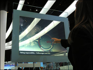 | Goodbye CO2 Interactive Pointscreen Interface based on a technology from the Fraunhofer institute: The visitors steer a flight through the sky catching and eliminating Co2 to get information how it is possible to safe Co2 in everyday life. The application shows how many Co2s were caught. kunst-stoff was responsible for concept, design, sound and software developement.